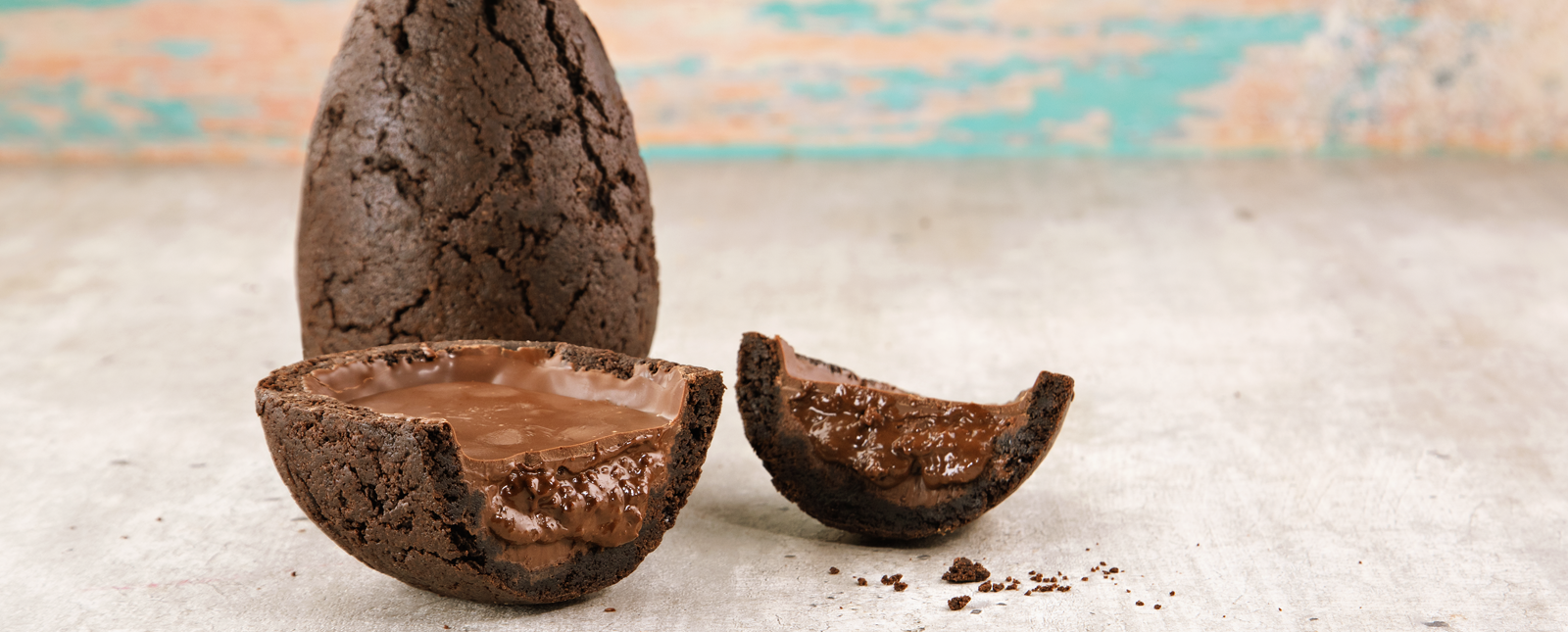 Com uma faca, corte pedaços de brownie mais ou menos do tamanho da forma para fazer ovo de páscoa.